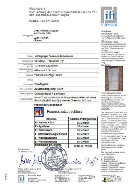 Fire resistant - With additional fire resistant components, the SKYDAS Premium door offers fire protection for up to 45 minutes and can withstand temperatures of 1000oC. The tests were carried out and the certificate NR. 271 36831 was issued in IFT Rosenheim (Germany) testing laboratory. Fire resistance is especially relevant in apartment buildings, where fire can spread from the neighbours or when the door is set on fire, and in private houses - from the boiler room or garage.