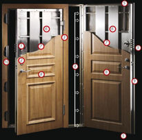 Safe - The specially bent L-shaped 115mm wide door frame is not only wider than that of an ordinary armoured door, but also has even 8 bending edges that reinforce the frame. The frame is fixed in the aperture by 17 plugs, which are protected from cutting by 24mm steel liners, and thus there is no need to set the door in concrete. Internal leaf construction is reinforced by rigid edges that will not easily permit deforming during forced access such as with a burglary attempt. At least one of the locks installed in this door model must be no lower than class 7 security. The locks are installed in protective steel boxes. The armoured lock is protected by 2 drilling resistant manganese plates and each lock pin is protected by a separate protective sleeve in the door frame.